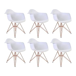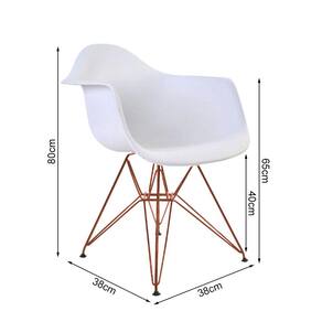 Kit 6 Poltronas Eiffel Eames Branca Com Braço Daw Em Ferro CobreA Poltrona Daw traz ousadia que combina com ambientes de estilo moderno, podendo ser usada em escritórios, cafés, salas de estar ou jantar e outros ambientes. Possuindo braços que a torna uma ótima escolha para quem está em busca de conforto e um design único.Tipo: PoltronaModelo: DawCor do Assento: BrancoCor da Base: CobreCARACTERÍSTICASAssento: PolipropilenoBase: FerroSuporta até: 120kgGarantia: 90 DiasDIMENSÕES DO PRODUTOAltura: 80cmAssento até o chão: 40cmBraço do assento até o chão: 65cmLargura: 38cmComprimento: 38cmRECOMENDAÇÕESLimpeza: Utilize um pano macio levemente úmido.Necessita montagem.ATENÇÃOAS IMAGENS SÃO MERAMENTE ILUSTRATIVAS E PODEM SOFRER VARIAÇÕES DE COR E PEQUENOS DETALHES DE ACORDO COM O SEU MONITOR, ILUMINAÇÃO DO AMBIENTE E ATÉ MESMO A SUA PERCEPÇÃO VISUAL.