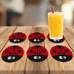 Os porta copos são feitos de materiais de alta qualidade, incluindo uma base de cortiça e uma camada superior de poliéster com estampa de joaninha;
