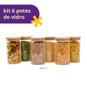 Kit 6 potes de vidro 600ml tampa de bambu herméticos redondos - Tüd