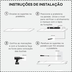 Instruções de Montagem: Posicione o produto na parede, e marque com um lápis o local onde estão os furos das prateleiras. Com uma furadeira, faça os furos nos locais marcados e insira a bucha e suporte de embutir que acompanham o produto, então encaixe a prateleira ou nicho.