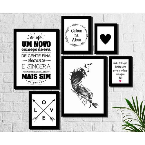 Kit 6 Quadros Decorativos Pena e Frases Preto e Branco 2 quadros 30x40 cm, 2 quadros 20x25 cm, 2 quadro 15x20 cm. Impressão digital em tecido canvas e montado em bastidor de madeira. Impressão nas laterais. Sobre o tecido canvas O tecido canvas é um material especial para impressão 100% algodão, com uma preparação especial resinada anti mofo. Apropriada para impressões de obras de artes e impressão de fotos tela, muito usadas em exposições em museus. A preparação do tecido encapsula o pigmento da tinta em uma camada protetora proporcionando resistência, o resultado é cores mais vivas e vibrantes sem perder a textura do tecido. É um material ecologicamente correto. Ean: 7908245601361