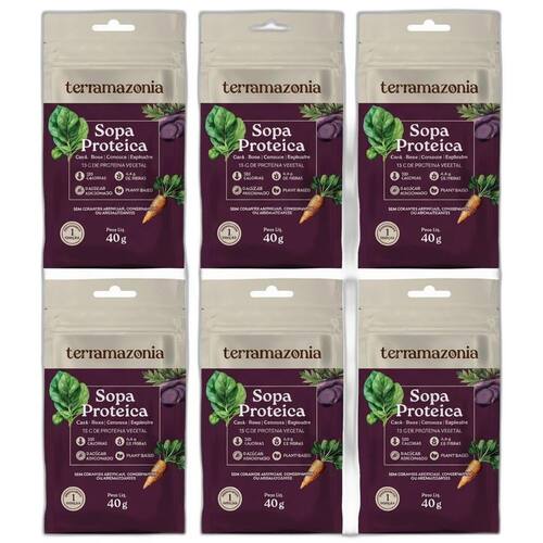 Kit 6 - perfeita para uma refeição ou lanche, prática e saborosa A sopa proteica é cremosa e com aquele temperinho que dá água na boca. - cará roxo, cenoura e espinafre o cará roxo é semelhante a batata e a batata doce - fonte de proteína 13g por porção - baixo teor calórico - carboidratos saudáveis - baixo índice glicêmico - fonte de fibras - feita com ingredientes naturais desidratados - sem adição de açúcar - vegana - rendimento: 8 porções - sem corantes artificiais, conservantes ou aromatizantes - rápida - fica pronta em 3 minutos - saborosa Descrição A sopa proteica é um alimento completo com alto teor de proteína vegetal, que possui como diferencial o uso de um tubérculo muito consumido na amazônia, o cará-roxo. A sopa é também uma opção para quem deseja fazer reposição de proteína, de forma prática, rápida e saborosa. O cará-roxo é rico em antocianinas e vitaminas, principalmente do complexo b. Também é rico em carboidratos complexos, de baixo índice glicêmico, além de fibras e pectina que ajudam na sensação de . A cenoura é rica em beta-caroteno, um poderoso antioxidante e . Tem efeito auxiliar na digestão, alto teor de fibras e de carboidratos complexos. O espinafre é rico em vitamina c, beta-caroteno, flavonóides e cálcio. Destaques Fonte de proteína 13g por porção Carboidratos saudáveis Sabor natural de cara-roxo Sugestão de consumo Adicione 40g 5 medidores em 300ml de água e leve ao fogo mexendo até a fervura. Continue por mais 3 minutos e sirva. Ingredientes Cará-roxo em pó, proteína isolada de ervilha, cenoura em pó, espinafre em pó, urucum em pó, pimenta do reino em pó, creme de cebola, tempero de ervas em pó, sal, goma xantana. Não contém glúten, não contém lactose.