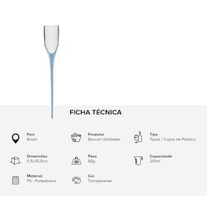 País: Brasil Produtor: Boccati Utilidades Tipo: Taças / Copos de Plástico Dimensões: 5,5 x 35,5cm Peso: 68g Capacidade: 210ml Material Taça: PS (Poliestireno) Material Haste: PP (Polipropileno) Cor Taça: Transparente Cor Haste: Azul Bebê