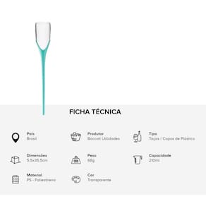 País: Brasil Produtor: Boccati Utilidades Tipo: Taças / Copos de Plástico Dimensões: 5,5 x 35,5cm Peso: 68g Capacidade: 210ml Material Taça: PS (Poliestireno) Material Haste: PP (Polipropileno) Cor Taça: Transparente Cor Haste: Verde Bebê
