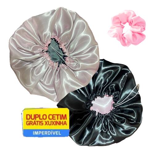 * Uso recomendado: Durante a noite * Tipo de cabelo recomendado: Todos * Modelo: Ajustável * Camadas: Dupla face (2 cores) * Itens Inclusos: 6 Toucas de cetim Ajustável dupla face e 6 Xuxinhas