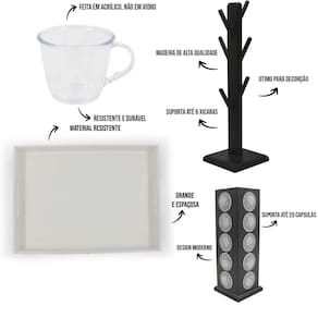 Kit 6 xicara porta capsulas para dolce gusto bandeja acrílico cores Cor xícaras: cristal Composição do kit;6 xícaras1 bandeja1 suporte de xícaras1 porta capsulas para nespressoXícara 85ml acrílica As xícaras são muito bonitas e esse acrílico traz um charme a mais ao produto, deixando-o mais decorativo para a hora do café. Você pode usar em casa ou no escritório, ter sempre à mão sua xícara para tomar aquele cafezinho, capuccino e até um chocolate quente se estiver com vontade. Capacidade 85mlMaterial - acrílicoAltura - 5,5 cmLargura - 8,5 cm Bandeja cantinho do café versátil e multiuso Feita em mdf de 6mm com pintura em tinta acrílica na cor preta ela é ideal para organizar o seu lar, servir um cafezinho para os amigos, organizar papeis de escritório entre diversas outras utilidades. Bandeja versátil de qualidade, combinando com todos os ambientes no qual estiver Suas medias são40x30x6 externa 38,5 x 28,5 x 5,5 na parte interna Possui as laterais vazadas como uma alça. Suporte porta xícara caneca em 6 pinos xicaras Esse é o produto ideal para decorar o seu tão especial cantinho do café ou até mesmo presentear uma pessoa querida, além da beleza o porta xicaras é feito em mdf que é muito resistente, ideal para xicaras/canecas de até 240ml. Com esse porta xicaras você vai conseguir deixar seus armários muito mais organizados. Medidas suporte:Altura: 36 cmBase: 11x11Peso: 282gMaterial de composição: madeira pinus Porta cápsula vazado a laser nespresso. O nosso porta cápsulas, guarda com segurança e deixa organizado prendendo bem a cápsula sem deixar cair produto bem desenvolvido com muito charme e tons modernos para deixar o ambiente mais bonito Esse porta cápsulas tem ar moderno que mescla os tons e veio da madeira de pinus com o local em preto aonde é encaixado as cápsulas sendo assim um da destaque ao outro organize seu canto do café com as cápsulas sempre a mão e ainda decore o seu ambiente com certeza vai ser uma peça que vai chamar a atenção e tirar elogios Feito em pinus de reflorestamento natural e de mdf com pintura em preto tinta acrílica Comporta 28 capsulas nespressoMedidas 32x10x10 O pinus é natural, não leva verniz e nem seladora. Por se tratar de madeira natural deve haver variações na tonalidade e apresentar veios da madeira em locais distintos. - entregam para todo país Quem somos Marca: Dupétriz