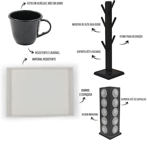 Kit 6 xicara porta capsulas para dolce gusto bandeja acrílico cores Cor xícaras: preto Composição do kit; 6 xícaras 1 bandeja 1 suporte de xícaras 1 porta capsulas para nespresso Xícara 85ml acrílica