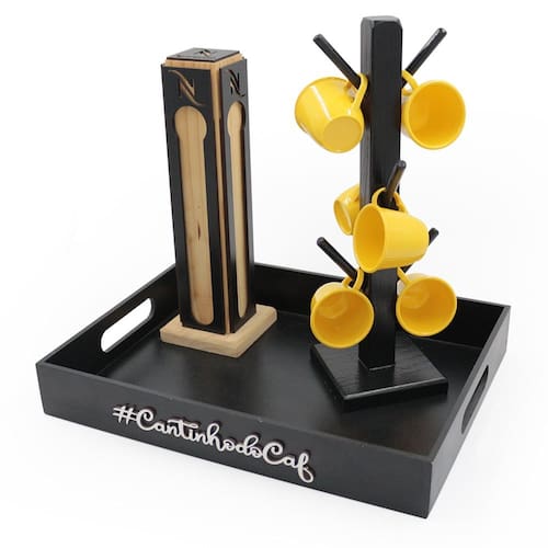 Esse porta cápsulas tem ar moderno que mescla os tons e veio da madeira de pinus com o local em preto aonde é encaixado as cápsulas sendo assim um da destaque ao outro organize seu canto do café com as cápsulas sempre a mão e ainda decore o seu ambiente com certeza vai ser uma peça que vai chamar a atenção e tirar elogios