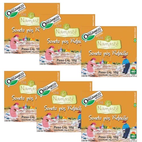 O Chá Soneto Pós Refeição Namastê é 100% Orgânico Certificado, puro e natural. Todas as propriedades das ervas estão na sua versão mais pura para trazer os melhores benefícios. O mix possui as melhores ervas que atuam no sistema digestivo: HORTELÃ, CARQUEJA, HIBISCO, ERVA-DOCE, ERVA-CIDREIRA Kit com 6 caixas, cada caixa contém 10 sachês Modo de preparo: Tempo de infusão: 6 a 8 minutos Temperatura da água: 90 graus Quantidade: 01 sache para 200ml de água Tomar quente ou gelado