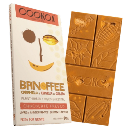 Uma das estrelas do Chocolate Banoffee Caramelo e Canela do Ceilão Vegano Cookoa é a banana, ela é orgânica e desidratada a baixas temperaturas e colhida nas terras da cabruca baiana. No coração da mesma floresta, compartilha o protagonismo com o coco, a mandioca e a castanha. Além disso, é adicionado um toque especial da ilustre Canela do Ceilão.