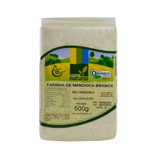Kit 6X: Farinha de Mandioca Branca Orgânica Coopernatural 500g A Farinha de Mandioca Branca Orgânica Coopernatural é cultivada a partir de sementes não transgênicas e livres de agrotóxicos e adubos químicos, contribuindo assim, com a biodiversidade.