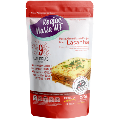A Massa Konjac Tipo Lasanha é um produto 100% feito da farinha do glucomannan (Konjac), contendo apenas 9 kcal a cada 100g, 0g de carboidratos.