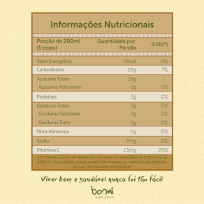 Ingredientes: Suco de tangerina integral (98,5%) e extrato de capim cidreira (1,5%). NÃO CONTÉM GLÚTEN.