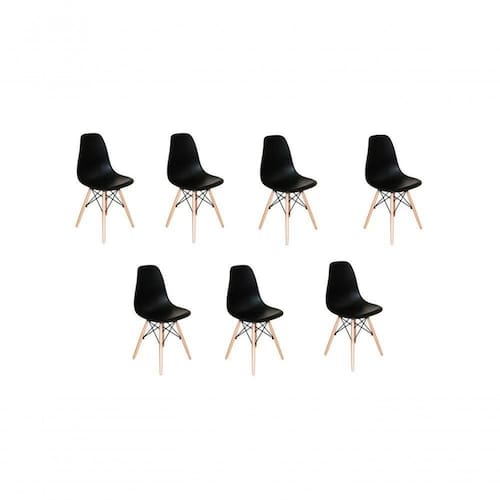 Kit 7 Cadeiras Charles Eames Eiffel Dkr Wood Preto Cadeira Eiffel Eames Base Madeira A CADEIRA CHARLES EAMES EIFFEL foi criada nos anos 50, é vencedora do Museu de Nova York da concorrência Design de Mobiliário Low-Cost Arte Moderna Internacional. Sua base é em MADEIRA no formato de uma torre faz com que o ambiente não fique sobrecarregado. Adequa-se perfeitamente para compor conjunto de mesa de jantar ou qualquer outro ambiente em sua casa ou escritório. Ideal para receber amigos e familiares com um toque de elegância e charme. As pernas da cadeira são em madeira e fios de aço preto no qual garantem estabilidade à cadeira.