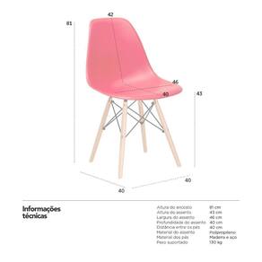 Cadeira modelo Eames DSW: Material do assento: Polipropileno - Material da base: Madeira e aço - Altura do encosto: 81 cm - Altura do assento: 43 cm - Largura do assento: 46 cm - Profundidade do assento: 40 cm - Distância entre os pés: 40 cm - Peso suportado: 130 kg - Garantia: 3 meses.