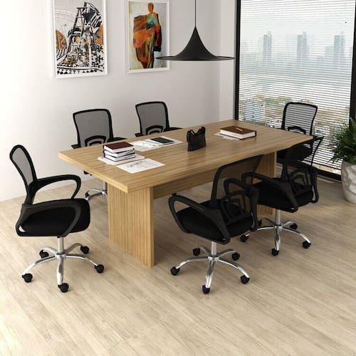 Essa mesa de reuniões é ideal para desempenhar tarefas diárias de trabalho, também como protagonista da sala de reuniões ela acomoda 8 pessoas. Suporta inúmeros objetos que você desejar é muito resistente, sustentando 25 kg de peso. Acabamento: BP Altura do Conjunto: 91 cm Ambiente: Escritório Ambiente Principal: Escritório Cor: Amêndoa/Preto Informação Complementar: 1x Mesa para Escritório Reunião 100x200cm ME4119 Amêndoa Largura: 200 cm Altura: 74 cm Profundidade: 100 cm Necessita Montagem: Sim