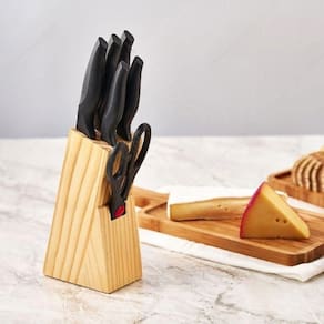 Deixe a sua cozinha mais completa e organizada com o conjunto de facas e tesoura acompanhado de um suporte charmoso da Clink.