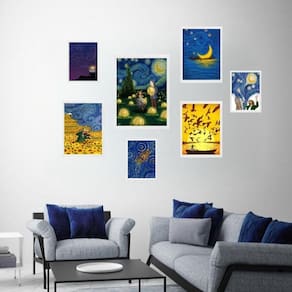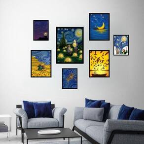 Kit 7 quadros decorativos van gogh Moldura: madeira branca Informações do produto tire todas as suas dúvidas no descritivo abaixo: decoração para quarto, sala, cozinha, escritório, área gourmet e muito mais. Chega de paredes vazias medidas - kit composto por 7 quadros, sendo 3 quadros com medida 18x24cm, 3 quadros com 24x33cm e 1 quadro com medida 33x45cm. Material do papel - papel fotográfico brilhante de altíssima resolução acabamento - todos os quadros são acompanhados de uma película de acetato para proteção da imagem. - os quadros são embalados de forma segura com plástico bolha com camada dupla de acordo com o tamanho dos quadros. Garantia - garantia de 3 meses. Meu quadro chegou. Como posso fixá-lo Você precisa apenas de um martelo e um prego, pois os quadros já vão acompanhados de penduradores. Esta é a forma mais indicada. Caso prefira, você pode utilizar uma fita dupla face neste caso, sugerimos de alta qualidade para evitar que descole e seu quadro caia . Como posso limpar meu quadro A limpeza é feita como um móvel comum da sua casa. Apenas um pano seco ou espanador são suficientes para tal