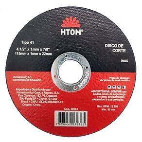 Kit com 70 Discos de Corte Fino 4 1/2 Pol. 115mm para Esmerilhadeira Inox Metal HTOM Disco de corte 115mm indicado para cortar inox e metal com esmerilhadeiras. Furo de 22mm e espessura de 1mm. - Marca: HTOM - Referência: HTOM-40563-70x - Kit com 70 Discos - Diâmetro: 4-12 115mm - Furo: 7/8 22m - Espessura: 1mm - Indicado para corte de metais em geral e aço inoxidável - Rotação máxima: 13.300 rpm - Composição: corundum branco - : 90 dias contra defeito de fabricação Marca: Não Informado