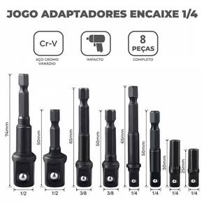 Jogo 8 adaptadores de soquete aço cr-v 1/4 3/8 1/2 para parafusadeira Chega de ficar trocando de ferramenta a todo momento Com o jogo de adaptadores de soquete 8 peças em aço cromo vanádio, você transforma sua parafusadeira ou furadeira em uma verdadeira máquina de torque, ganhando agilidade, versatilidade e produtividade em qualquer montagem, reparo ou manutenção. Vantagens que você sente na hora: - compatível com parafusadeiras e furadeiras de encaixe sextavado 1/4 - fabricado em aço cr-v cromo vanádio - resistência máxima ao desgaste - 8 tamanhos essenciais para o dia a dia - e doméstico - ideal para montagens, móveis, automóveis, marcenaria, hidráulica e mais - compacto, leve e fácil de guardar O que você recebe - 1 adaptador 1/4 x 50mm - 1 adaptador 3/8 x 50mm - 1 adaptador 1/2 x 50mm - 1 adaptador 1/4 x 65mm - 1 adaptador 3/8 x 65mm - 1 adaptador 1/2 x 74mm - 1 adaptador 1/4 x 25mm - 1 adaptador 1/4 x 30mm Resistência Fabricado em aço cromo vanádio conhecido pela alta durabilidade, resistência ao impacto e precisão no encaixe. Supera aço carbono comum. Pode ser utilizado com impacto Compatibilidade: - parafusadeiras com encaixe sextavado 1/4 - furadeiras elétricas com mandril - chaves manuais com entradas compatíveis 1. Serve em parafusadeira comum Sim desde que o encaixe seja sextavado padrão 1/4, funciona perfeitamente. Também pode ser em furadeiras com mandril comum. 2. Posso usar com chave de impacto Sim, mas com moderação. Esses adaptadores não são específicos para impacto industrial, mas aguentam bem uso intenso em parafusadeiras de impacto leve a moderado. 3. É feito de aço comum Não é feito de aço cromo vanádio cr-v , muito mais durável e resistente à torção e desgaste do que o aço carbono convencional. 4. Posso usar em trabalhos automotivos Sim é ideal para uso em manutenções leves a médias, desde montagem de peças, desmontagens e ajustes com parafusadeiras. 5. Tem trava de segurança ou de retenção Sim. Os adaptadores possuem de retenção, que ajuda a manter o soquete firme durante o uso. Marca: Não Informado Ean: 7734625969932