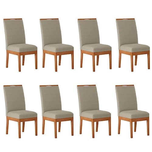 Características do Produto Material da estrutura: MDF 15mm/Madeira Maciça. Acabamento: PU. Escala de Brilho: Fosco. Peso Suportado: 120 kg . Revestimento: Facto Plus. Densidade da Espuma Encosto: D14. Densidade da Espuma Assento: D23. Diferenciais: - Design moderno. - Matéria-prima de altíssima qualidade. - Encosto robusto, ergonômico e confortável, com espaldar em madeira. - Assento suspenso em quadro de madeira. Sistema de Montagem: Parafusos. Manual de Montagem: Não. Complexidade da Montagem: O produto vai montado. Volumes: 4 Volumes. Conteúdo da Embalagem: 8 Cadeiras. Garantia do Fabricante: 90 dias contra defeito de fabricação. Montagem: Recomendamos que seja feita por um profissional. Recomendação de Limpeza: Utilize pano levemente úmido.