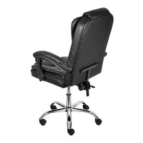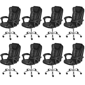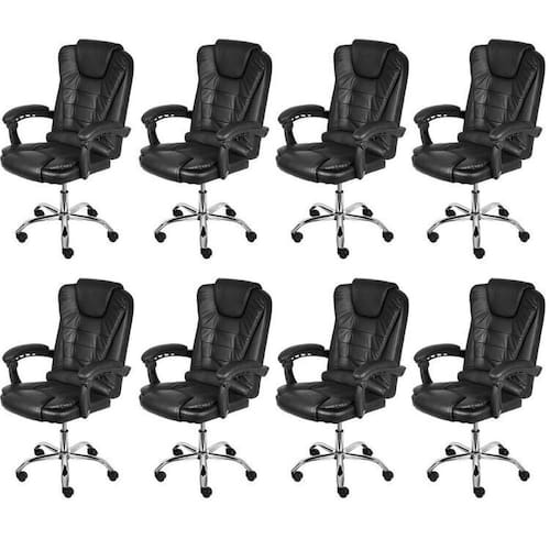 A cadeira Jacarta possui revestimento em PU, sistema relax com travamento, apoio de lombar e braços acolchoados. Base cromada giratória com rodízios PU que não danificam o piso. Cadeira imponente e muito confortável, em função do seu encosto alto. Altura do Conjunto: 107 cm Ambiente: null Ambiente Principal: Escritório Cor: Preto Informação Complementar: 8x Cadeira para Escritório Presidente Estofada Jacarta Preto Largura: 52 cm Altura: 107 cm Peso: 9 kg Profundidade: 78 cm Necessita Montagem: Sim