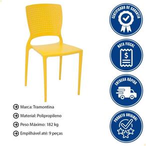DESCRIÇÃO - Para compor ambientes confortáveis e cheios de estilo, apresentamos a cadeira Tramontina Safira em polipropileno e fibra de vidro amarela. - Altamente resistente e durável, ela suporta cargas de até 182 quilos. - Sua cor é amarela e conta com um design moderno e versátil, inspirado em uma das pedras preciosas mais conhecidas!