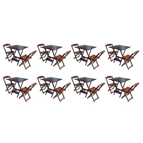 Kit 8 Conjuntos De Mesa Dobravel Com 2 Cadeiras De Madeira 70x70 - Imbuia é ideal para bares, restaurantes, estabelecimentos, áreas de lazer e também para sua casa. Seu design permite que seja encaixado em qualquer ambiente, trazendo um toque a mais para seu estabelecimento. Além de sua durabilidade, o que lhe trará conforto para servir seus clientes. Por ser dobrável torna-se mais fácil guardar, manusear e limpar o produto. Atenção: EVITE USAR PRODUTOS ABRASIVOS E QUíMICOS PARA LIMPEZA DO PRODUTO, aconselha-se o uso de pano umedecido para melhor conservação; mantenha o produto fora de chuva e sol constantes. Dimensões: Medidas da Mesa: Altura: 76cm Largura: 70cm Comprimento: 70cm