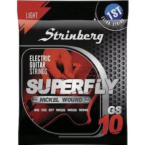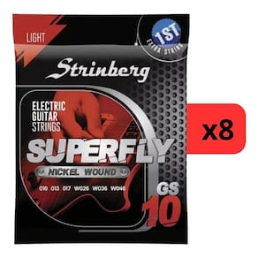 Kit 8 Encordoamento Strinberg Para Guitarra GS10 - 6 CordasO Kit 8 Encordoamentos Strinberg para Guitarra GS10 de 6 cordas é a escolha perfeita para elevar o desempenho da sua guitarra. Com qualidade e durabilidade excepcionais, esses encordoamentos proporcionam um som claro e vibrante, permitindo que você explore todo o potencial do seu instrumento. Seja para tocar acordes encorpados ou solos expressivos, o Kit 2 Encordoamentos Strinberg GS10 garante uma resposta precisa e um tom consistente. Renove o som da sua guitarra e adicione um toque profissional às suas apresentações com esses encordoamentos confiáveis e de alta qualidade.Especificações Técnicas:• Modelo: GS-10• Espessuras: 1º - .010 / 2º - .013 / 3º - .017 / 4º - .026 / 5º - .036 / 6º - .046• Revestimento de bordões: Níquel.Conteúdo da Embalagem:• Kit 8 Encordoamento Strinberg Para Guitarra GS10 - 6 Cordas• Manual e Certificado de GarantiaImportante:• Garantia de 90 Dias.• Valor Kit.