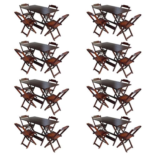 Kit 8 Jogos De Mesa Com 4 Cadeiras De Madeira Dobravel 120x70 Ideal Para Bar E Restaurante - Imbuia é ideal para bares, restaurantes, estabelecimentos, áreas de lazer e tambem para sua casa. Feito em madeira maciça, tornando resistentes e duráveis. Seu design permite que seja encaixado em qualquer ambiente, trazendo um toque a mais para seu estabelecimento. Além de sua durabilidade, o que lhe trará conforto para servir seus clientes. Por ser dobrável torna-se mais fácil guardar, manusear e limpar o produto. Atenção: EVITE USAR PRODUTOS ABRASIVOS E QUíMICOS PARA LIMPEZA DO PRODUTO, aconselha-se o uso de pano umedecido para melhor conservação; mantenha o produto fora de chuva e sol constantes MESA Cor: Imbuia Modelo: Dobravel Dimensões: Altura 75 | Largura 70 | Profundidade 120 CADEIRA Cor: Imbuia Modelo: Dobravel Dimensões: Altura 80 | Largura 45 | Profundidade 42