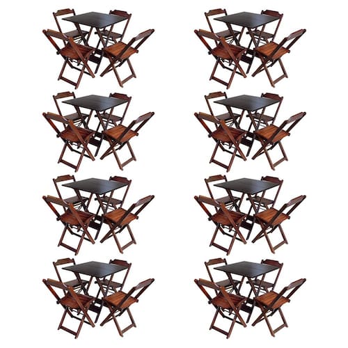 Kit 8 Jogos De Mesa Com 4 Cadeiras De Madeira Dobravel 70x70 Ideal Para Bar E Restaurante - Imbuia é ideal para bares, restaurantes, estabelecimentos, áreas de lazer e tambem para sua casa. Feito em madeira maciça, tornando resistentes e duráveis. Seu design permite que seja encaixado em qualquer ambiente, trazendo um toque a mais para seu estabelecimento. Além de sua durabilidade, o que lhe trará conforto para servir seus clientes. Por ser dobrável torna-se mais fácil guardar, manusear e limpar o produto. Atenção: EVITE USAR PRODUTOS ABRASIVOS E QUíMICOS PARA LIMPEZA DO PRODUTO, aconselha-se o uso de pano umedecido para melhor conservação; mantenha o produto fora de chuva e sol constantes MESA Cor: Imbuia Modelo: Dobravel Dimensões: Altura 76cm | Largura 70cm | Profundidade 70cm CADEIRA Cor: Imbuia Modelo: Dobravel Dimensões: Altura 80cm | Largura 45cm | Profundidade 42cm