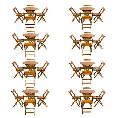 Kit 8 Jogos De Mesa Dobravel Com 4 Cadeiras Tampo Redondo 70x70 Mel é ideal para bares, restaurantes, estabelecimentos, áreas de lazer e tambem para sua casa. Feito em madeira maciça, tornando resistentes e duráveis. Seu design permite que seja encaixado em qualquer ambiente, trazendo um toque a mais para seu estabelecimento. Além de sua durabilidade, o que lhe trará conforto para servir seus clientes. Por ser dobrável torna-se mais fácil guardar, manusear e limpar o produto. Atenção: EVITE USAR PRODUTOS ABRASIVOS E QUíMICOS PARA LIMPEZA DO PRODUTO, aconselha-se o uso de pano umedecido para melhor conservação; mantenha o produto fora de chuva e sol constantes MESA Cor: Mel Modelo: Dobravel Dimensões: Altura 75cm | Largura 70cm | Profundidade 70cm CADEIRA Cor: Mel Modelo: Dobravel Dimensões: Altura 80cm | Largura 45cm | Profundidade 42cmKit 8 Jogos de Mesa Dobravel com 4 Cadeiras Tampo Redondo 70x70 Mel Marca: Preguiçosa