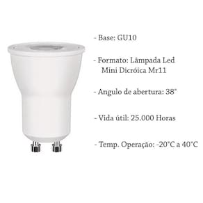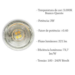 - base: gu10 - formato: mr11 - temperatura de cor: 3000k branco quente - tensão: bivolt - potência: 3w - fator de potência: 0.40 - fluxo luminoso: 221 lm - eficiência luminosa: 73,7 lm/w - ângulo de abertura: 38 - vida útil : 25.000 horas - temp. De operação: -20c 40c - frequência: 50/60hz