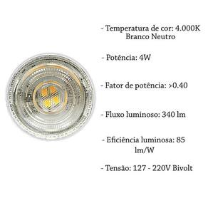 - base: gu10 - formato: mr11 - temperatura de cor: 4000k branco neutro - tensão: bivolt - potência: 4w - fator de potência: 0.40 - fluxo luminoso: 340 lm - eficiência luminosa: 85 lm/w - ângulo de abertura: 38 - vida útil : 25.000 horas - temp. De operação: -20c 40c - frequência: 50/60hz Ean: 7891072790059