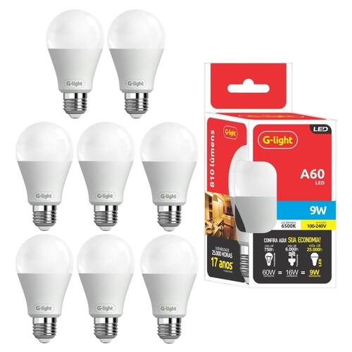 Kit 8 lâmpadas led branco frio 9w 810 lumens formato bulbo iluminação funcional a lâmpada led branco frio da g-light é utilizado em ambientes comerciais e de trabalhos, como escritórios, fábricas, lojas e cozinhas. Elas criam uma atmosfera fresca e para aumentar o foco e a atenção. Elas são extremamente duráveis, tendo vida útil estimada em 25000 horas. Também são mais eficientes no consumo de energia, gastam muito menos para gerar a mesma iluminação de uma lâmpada fluorescente e incandescente e elas não requerem manutenção regular como a troca de filamentos ou limpeza de filtros. Temos no formato bulbo com ângulo de abertura de 150, potência de 9w, fluxo luminoso de 810 lumens, eficiência de 90 lumens/watts e soquete e27 comum. Ela é autovolt, pode ser conectada em redes elétricas de 100v até 240v de forma automática, funcionando em qualquer região do país. Este anúncio é um kit com 8 unidades no pacote. Sobre o produto: - marca: g-light - modelo: a60 - cor do produto: branco - garantia de fábrica: 24 meses - medidas do produto: 10,8 x 6 cm - peso do produto: 33 gramas