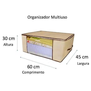 Modelo: Organizador Guarda Roupa Multiuso Material: TNT, Plástico no Visor e Zíper Duplo para fechar Visor: Parte frontal transparente Medida Comprimento x Largura x Altura : 60 x 45 x 30 cm Contém: Kit com 8 Organizadores. Ean: 7908788500862