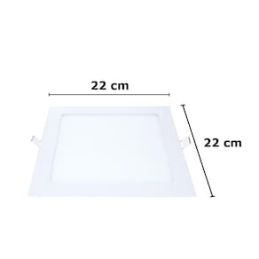 Informações técnicas: LED integrado Potência: 18W Temperatura: 6500K Emissão de luz fria Medida: 22x22 cm Forma: Quadrado Lúmens: 1260 IRC: =70 Ângulo de abertura: 120 Material: Corpo em alumínio, difusor em vidro, corpo do driver em plástico Eficiência luminosa: 70lm/W Painel de embutir Vida útil: 25 mil horas L70 Pode ser ligado diretamente na rede elétrica em 127V ou 220V Espessura do forro deve ser pelo menos 1cm Não permite dimerização