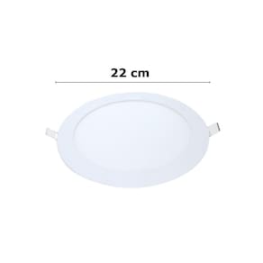 Informações técnicas: LED integrado Potência: 18W Temperatura: 4000K Emissão de luz neutra Diâmetro: 22 cm Forma: Redondo Lúmens: 1260 IRC: =70 Ângulo de abertura: 120 Material: Corpo em alumínio, difusor em vidro, corpo do driver em plástico Eficiência luminosa: 70lm/W Painel de embutir Vida útil: 25 mil horas L70 Pode ser ligado diretamente na rede elétrica em 127V ou 220V Espessura do forro deve ser pelo menos 1cm Não permite dimerização