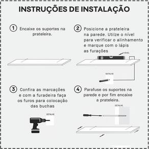 Instruções de Montagem: Posicione o produto na parede, e marque com um lápis o local onde estão os furos das prateleiras. Com uma furadeira, faça os furos nos locais marcados e insira a bucha e suporte de embutir que acompanham o produto, então encaixe a prateleira ou nicho.
