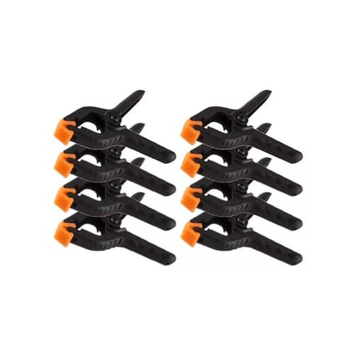 - características: Mordente plástico articulado, para melhor aderência a superfície. Dentes na base para melhor fixação do grampo. Cabo com sistema de mola gerando maior pressão.