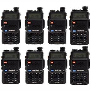Kit 8 Rádios Comunicador Dual Band Baofeng Uv-5r Vhf Uhf Rádio Baofeng UV5R com alcance de 12 quilômetros aproximadamente em campo aberto, como fazenda, sítio, praia, entre outros, e 800 metros aproximadamente em ambientes fechados, com divisórias, paredes por exemplo. Além de se comunicar, você poderá ouvir rádio FM nele, e possui uma lanterna com luz de LED bem forte em caso de emergências.