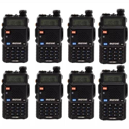 Kit 8 Rádios Comunicador Ht Uhf Vhf Baofeng Uv-5r Dual Band Cor Preto Rádio Baofeng UV5R com alcance de 12 quilômetros aproximadamente em campo aberto, como fazenda, sítio, praia, entre outros, e 800 metros aproximadamente em ambientes fechados, com divisórias, paredes por exemplo. Além de se comunicar, você poderá ouvir rádio FM nele, e possui uma lanterna com luz de LED bem forte em caso de emergências.