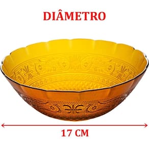Características Gerais do Produto: - Material: Vidro - Modelo: Tigela Amber em Vidro - Cor: Amarelo - Dimensões aproximadas: Altura 6cm X Diâmetro 17cm - Capacidade em litros: 650ml Garantia: - Garantia do site - 1 Mês
