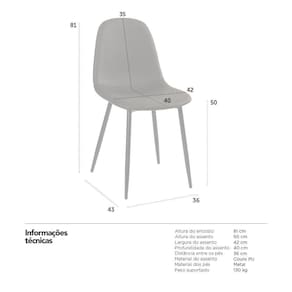 Material do assento: Couro PU - Material dos pés: Metal - Altura do assento: 50 cm - Largura do assento: 42 cm - Profundidade do assento: 40 cm - Distância entre os pés: 36 cm - Peso suportado: 130 kg - Garantia: 3 meses.