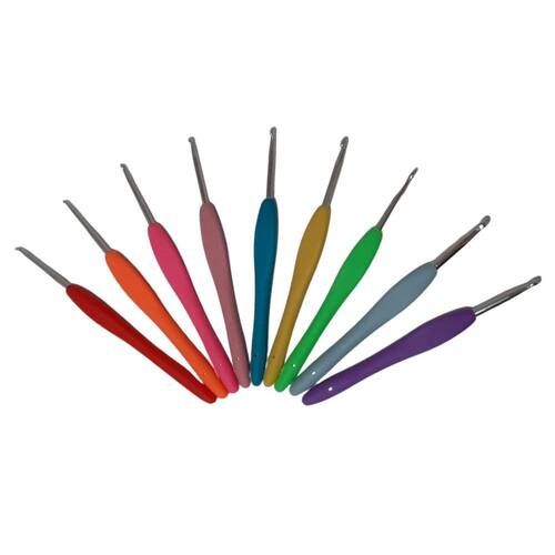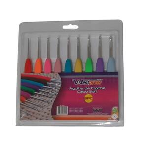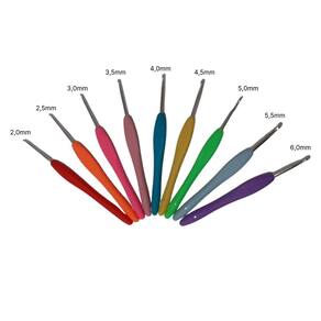 Kit 9 Agulhas De Crochê Cabo Soft Emborrachado Colorido Excelentes agulhas em Alumínio com um cabo emborrachado, que proporciona uma fácil pegada e conforto para o trabalho. Além de lindas e coloridas, possuem ponta em alumínio e cabo emborrachado, que proporciona o ajuste à mão confortavelmente e uma fácil pegada. As Agulhas Soft não oxidam e deslizam super bem, dando maior conforto ao trabalho. Flexíveis, duráveis e com design que alia conforto e beleza são ideias para trabalhos com todos os tipos de fios, dos mais finos aos mais grossos. Kit 9 Agulhas Crochê Cabo Soft (Emborrachado):