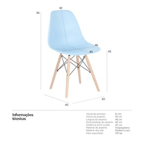 Cadeira modelo Eames DSW: Material do assento: Polipropileno - Material da base: Madeira e aço - Altura do encosto: 81 cm - Altura do assento: 43 cm - Largura do assento: 46 cm - Profundidade do assento: 40 cm - Distância entre os pés: 40 cm - Peso suportado: 130 kg - Garantia: 3 meses.