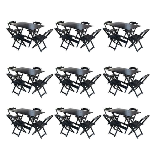 Kit 9 Conjuntos De Mesa Dobravel Com 4 Cadeiras De Madeira 120x70 Para Restaurante E Bar - Preto O produto é ideal para bares, restaurantes, estabelecimentos, áreas de lazer e também para sua casa. Feito em madeira maciça, tornando resistentes e duráveis. Seu design permite que seja encaixado em qualquer ambiente, trazendo um toque a mais para seu estabelecimento. Além de sua durabilidade, o que lhe trará conforto para servir seus clientes. Por ser dobrável torna-se mais fácil guardar, manusear e limpar o produto.