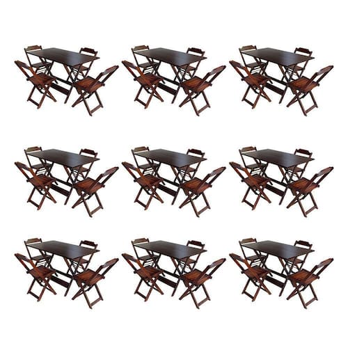 Kit 9 Jogos De Mesa Dobravel Com 4 Cadeiras De Madeira 120x70 Para Restaurante E Bar - ImbuiaO produto é ideal para bares, restaurantes, estabelecimentos, áreas de lazer e também para sua casa. Feito em madeira maciça, tornando resistentes e duráveis. Seu design permite que seja encaixado em qualquer ambiente, trazendo um toque a mais para seu estabelecimento. Além de sua durabilidade, o que lhe trará conforto para servir seus clientes. Por ser dobrável torna-se mais fácil guardar, manusear e limpar o produto.Atenção: EVITE USAR PRODUTOS ABRASIVOS E QUÍMICOS PARA LIMPEZA DO PRODUTO, aconselha-se o uso de pano umedecido para melhor conservação; mantenha o produto fora de chuva e sol constantes.OBS: MDF ULTRAModelo: DobrávelCor: ImbuiaMedidas Mesa:Altura: 75cmLargura: 70cmComprimento: 120cmMedidas Cadeiras:Altura: 80cmLargura: 45cmComprimento: 42cmOBS: Evite usar produtos abrasivos e químicos para limpeza do produto, aconselha-se o uso de pano umedecido para melhor conservação; mantenha o produto fora de chuva e sol constantes.ATENÇÃOIMAGENS MERAMENTE ILUSTRATIVAS REALIZADO EDIÇÃO, PODENDO HAVER UMA PEQUENA VARIAÇÃO DE COR DEPENDENDO DE CADA TELA OU MONITOR.Kit 9 Jogos de Mesa Dobravel com 4 Cadeiras de Madeira 120x70 para Restaurante e Bar - Imbuia
