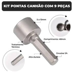 Kit 9 soquete canhão 5 a 13mm encaixe 1/4 para parafusadeira Deixe seu trabalho mais rápido e preciso O jogo de soquete canhão 9 peças foi feito para quem valoriza agilidade, precisão e praticidade na hora de apertar ou soltar porcas e parafusos. Com medidas que vão de 5 mm a 13 mm, esse kit é compatível com a maioria dos tamanhos no dia a dia, desde pequenos reparos até em oficinas. O que este kit entrega - 9 tamanhos essenciais 5 a 13mm - encaixe universal 1/4 compatível com parafusadeiras - tamanho compacto 48mm : alcance em espaços estreitos - ideal para mecânica, marcenaria, montagem de móveis e muito mais Rápido, eficiente, sem complicação Desfrute de encaixe perfeito e evite desgaste das peças. O formato canhão permite acessar áreas difíceis com facilidade, enquanto o material resistente oferece longa vida útil, mesmo sob uso intenso. Indicado para - oficinas automotivas - manutenção predial - reparos domésticos - montadores de móveis - técnicos em campo - profissionais que não têm tempo a perder Conteúdo da embalagem - 1 soquete 5mm - 1 soquete 6mm - 1 soquete 7mm - 1 soquete 8mm - 1 soquete 9mm - 1 soquete 10mm - 1 soquete 11mm - 1 soquete 12mm - 1 soquete 13mm 1. É compatível com parafusadeira elétrica comum Sim o encaixe é de 1/4, padrão em praticamente todas as parafusadeiras elétricas ou manuais do mercado. 2. Serve para apertar porcas automotivas Serve para porcas pequenas a médias. Para porcas maiores, como de rodas, recomendamos soquetes maiores. 3. O material é resistente mesmo Sim. Fabricado em espacial que garante durabilidade e resistência ao desgaste. 4. Qual o comprimento de cada peça Todos os soquetes possuem comprimento de 48 mm, ideal para locais de difícil acesso. 5. Vem com estojo ou organizador Este modelo não acompanha estojo, mas é enviado em embalagem segura e organizada. Marca: Não Informado Ean: 7895315022358