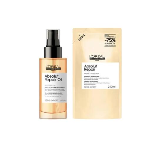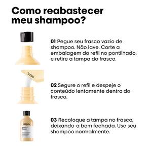 O Shampoo L'Oréal Professionnel Serie Expert Absolut Repair Gold Quinoa + Protein é indicado para cabelos danificados, promovendo reparação, brilho e leveza. Sua fórmula restaura a fibra capilar e melhora a aparência dos fios, deixando-os mais saudáveis, macios e maleáveis. Com uma ação que reduz danos, oferece hidratação profunda sem pesar o cabelo. A versão refil de 240ml permite reabastecer o frasco de 300ml, utilizando 75% menos plástico, com capacidade para 24 lavagens.